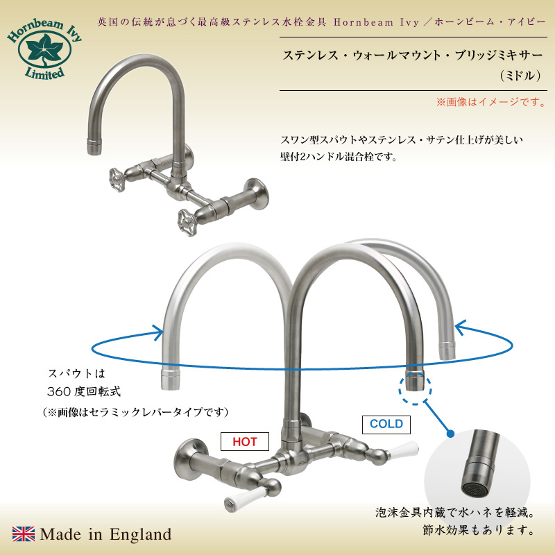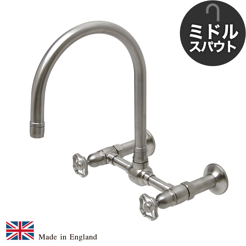 スワン型スパウトやステンレス・サテン仕上げが美しい2ハンドル水栓金具。
