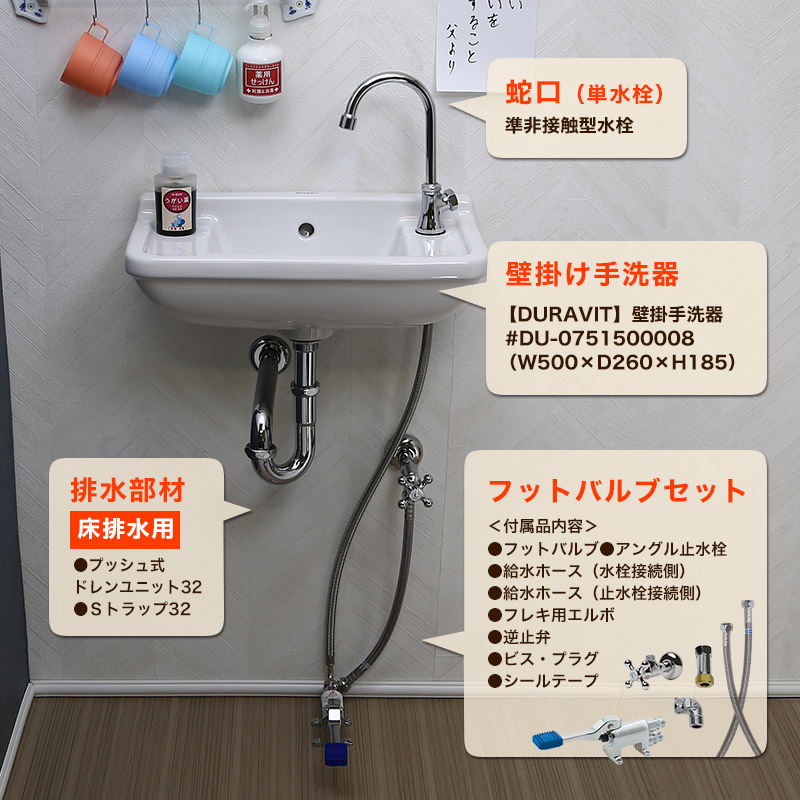 セットの水栓は泡沫仕様で水ハネを防ぎます。