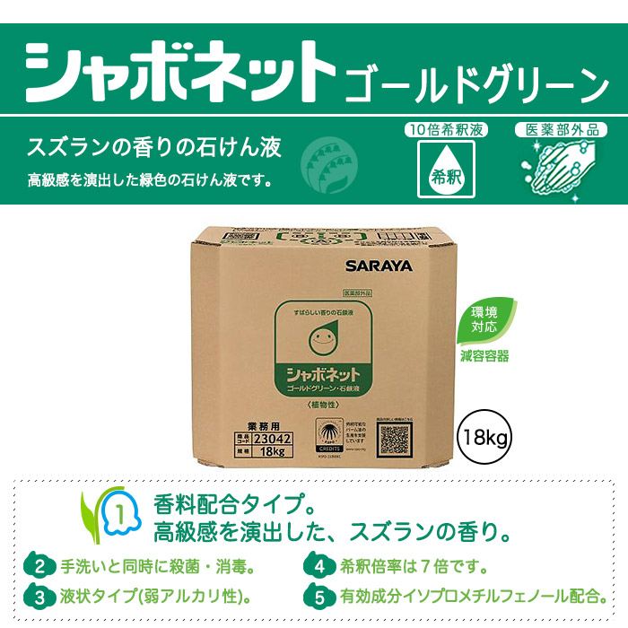 この商品は、シャボネット ゴールドグリーン 手洗い用石けん液 18kg 八角 B.I.B 液状 7倍希釈液 弱アルカリ性 医薬部外品 スズランの香りです。