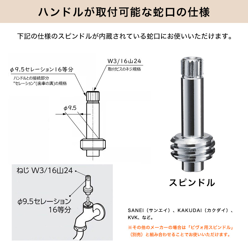 適合メーカー SANEI(サンエイ)、KAKUDAI(カクダイ)、KVK、など、対応スピンドルの仕様をご参照の上ご判断ください。