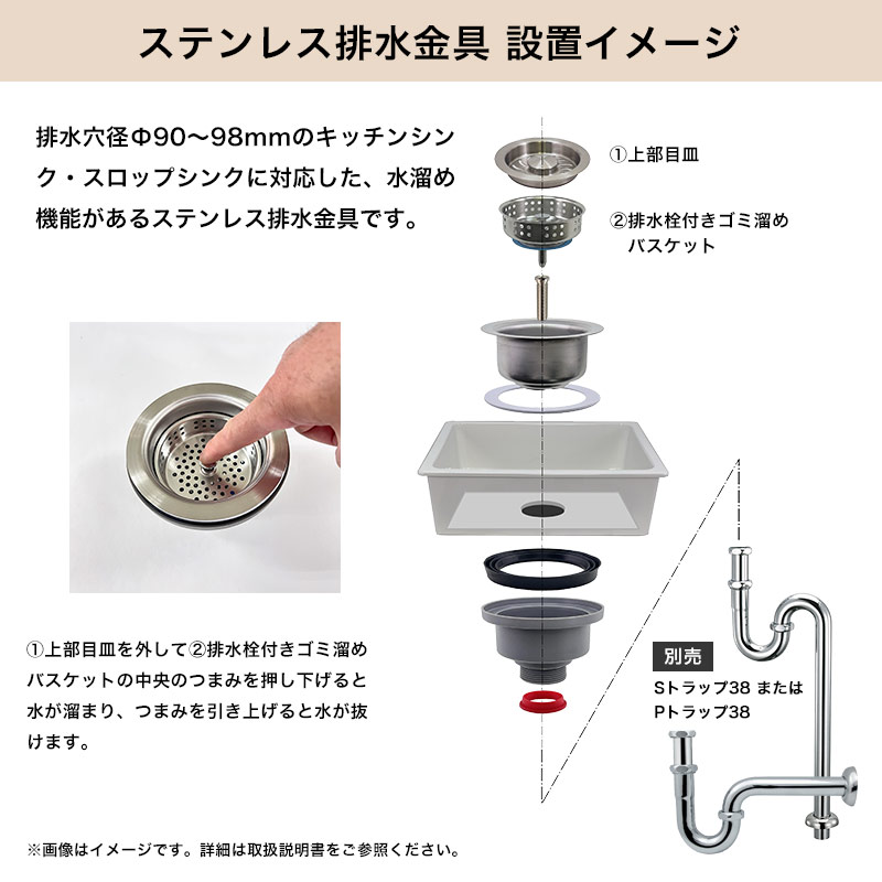 日本製・海外製を問わず、排水穴径 φ90~98mm のシンクに対応した排水金具です。