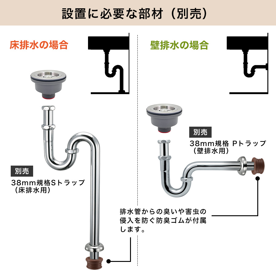 38ミリ規格の排水トラップ管と組合わせてご使用ください。