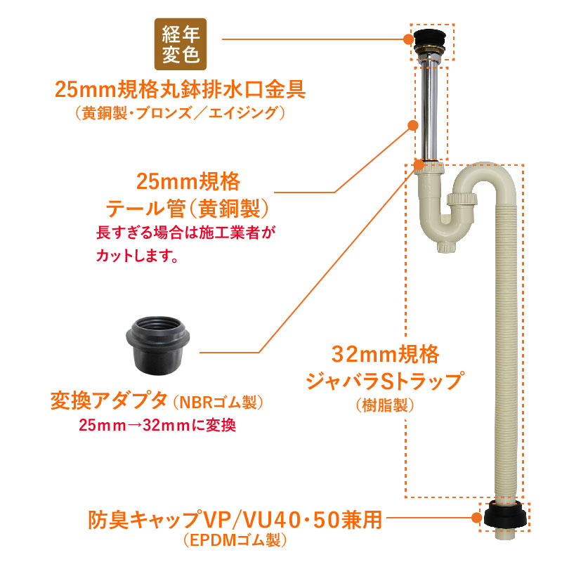 丸鉢排水口金具25:ブロンズ/エイジング仕上げ/黄銅 ※より深くアンティークな味わいに経年変色します。 テール管:クロムめっき/黄銅 変換アダプタ:NBRゴム トラップ管:樹脂 防臭キャップ:EPDMゴム |