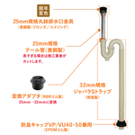 ※この商品は、25mm規格の上部排水金具と32mm規格のトラップ管(ジャバラホース)を組み合わせた商品です。テール管と排水トラップの間に32mm規格用変換アダプタを取り付けて接続しています。