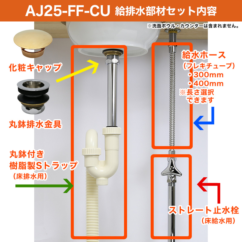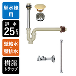 排水金具は25mm規格を、給水は単水栓を想定した給排水部材セットです。