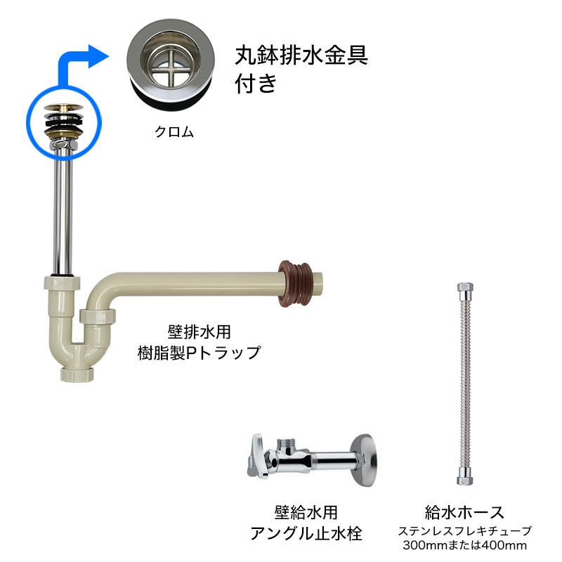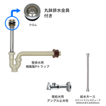 丸鉢排水口金具付き樹脂製の排水トラップ・三角ハンドル止水栓・フレキチューブを組み合わせた