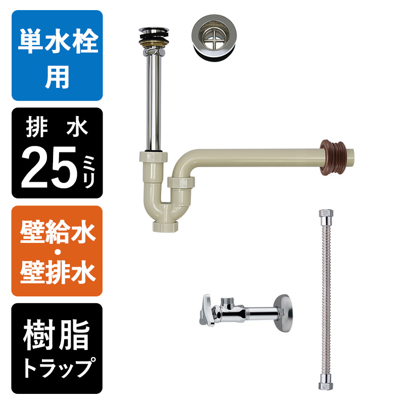 排水金具は25mm規格を、給水は単水栓を想定した給排水部材セットです。