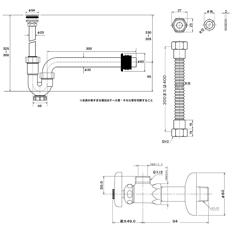 シンク下が隠れる場合におすすめの価格を抑えた給排水部材セットです。セットのフレキチューブ(給水ホース)は300mmまたは400mmから選べます。