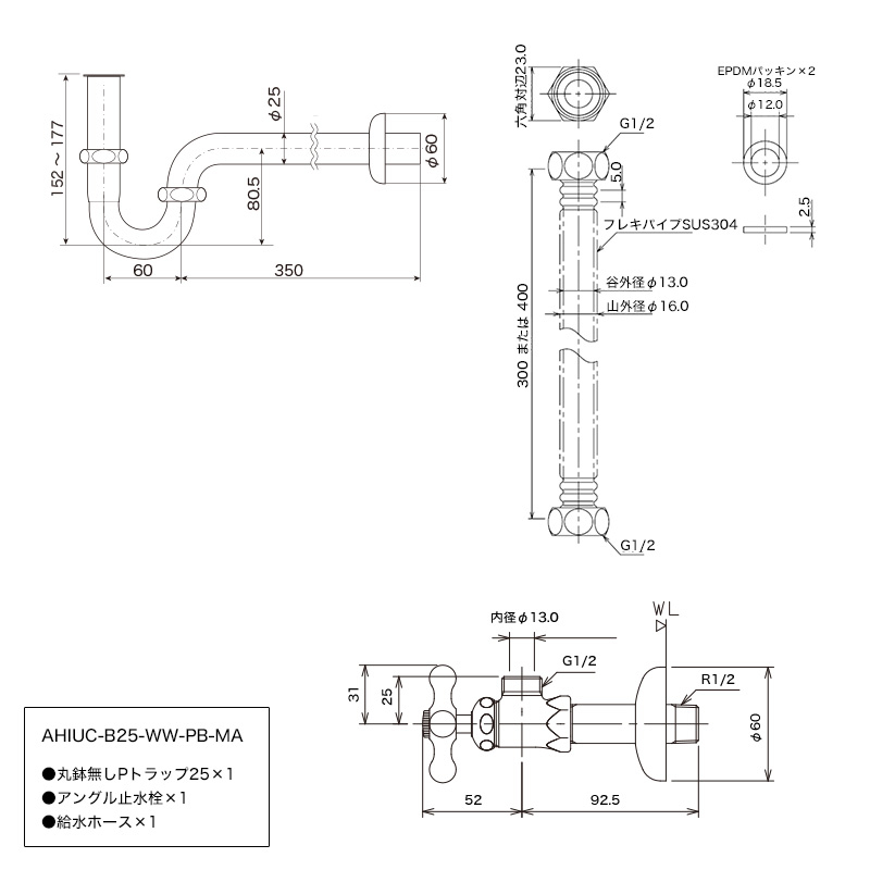 ※この商品は「壁給水(アングル止水栓)」「壁排水(Pトラップ)」を想定したセットです。