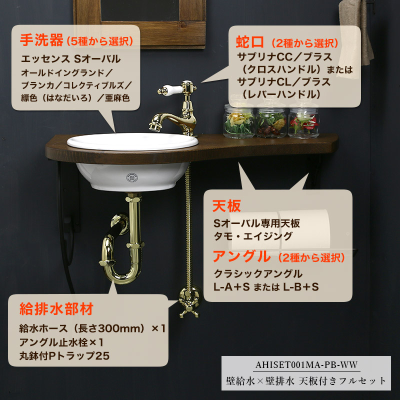 蛇口は2タイプ(陶器サインはCOLDまたはHOTから選択)、手洗器は5種類、天板を支えるアングルも2種類の中から選べます。