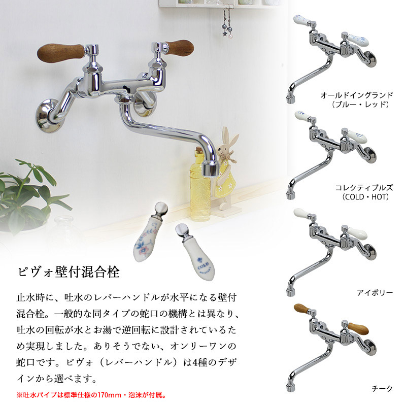ピヴォ壁付混合栓は、ハンドルが陶器、木製など4種類から選べます。排水金具は設置環境に合わせて、床排水用のSトラップ、壁排水用のPトラップの2タイプの中から選べます。