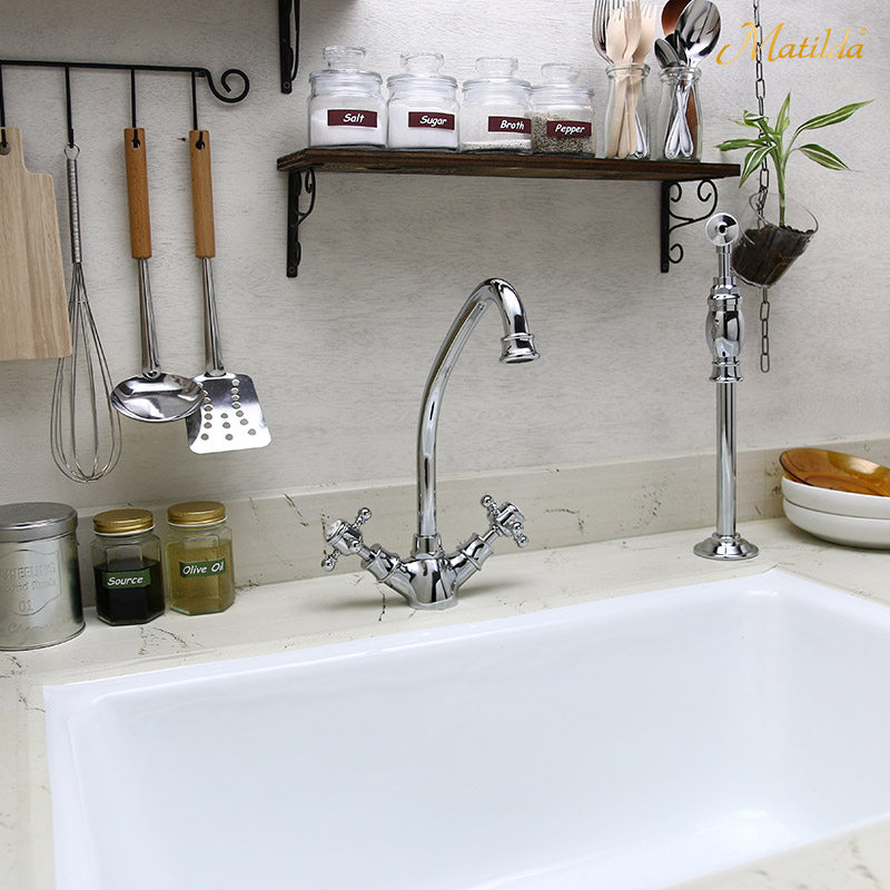 アンティーク水栓マチルダのキッチン混合栓&単水栓に、ビルトイン型浄水器ユニットがセットになったナチュラルアンティークなウォーターサーバーセットができました!