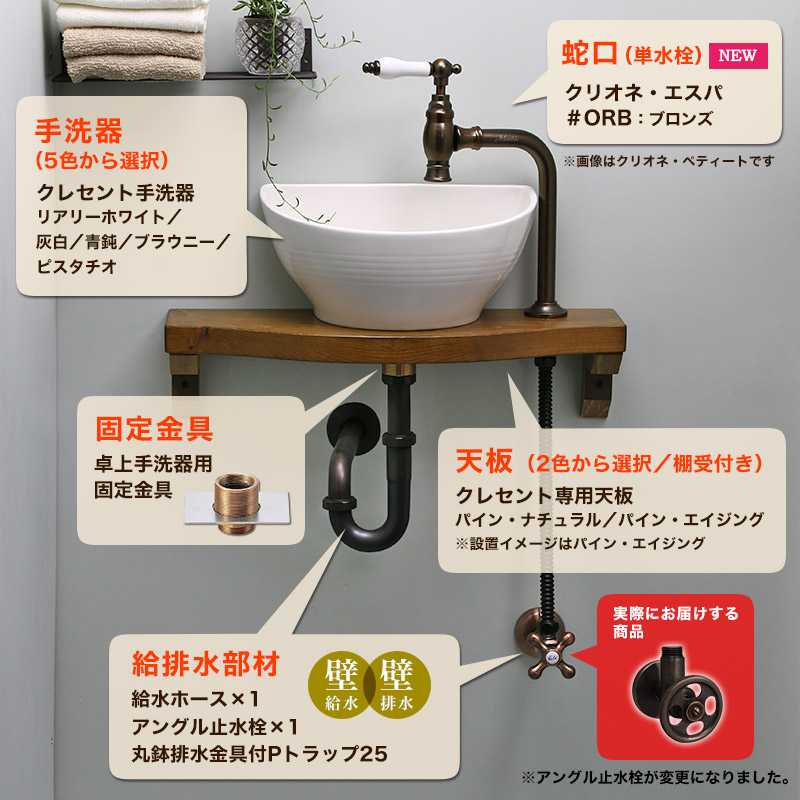 ミドルサイズの立水栓クリオネ・エスパと、置き型ボウルの中でも個性的な半月型のフォルムで人気のクレセント手洗器との組み合わせは、デザイン的にも使い勝手も文句なしのベストコンビ!ボウルの色によって雰囲気や表情も変わるので、お気に入りの組み合わせをじっくり選んでくださいね。