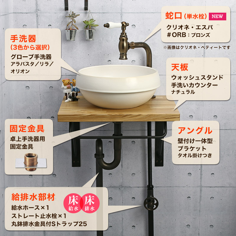 こちらのセットには専用の天然木の天板と取り付けに必要な部材が一式含まれているので、施主支給も安心。