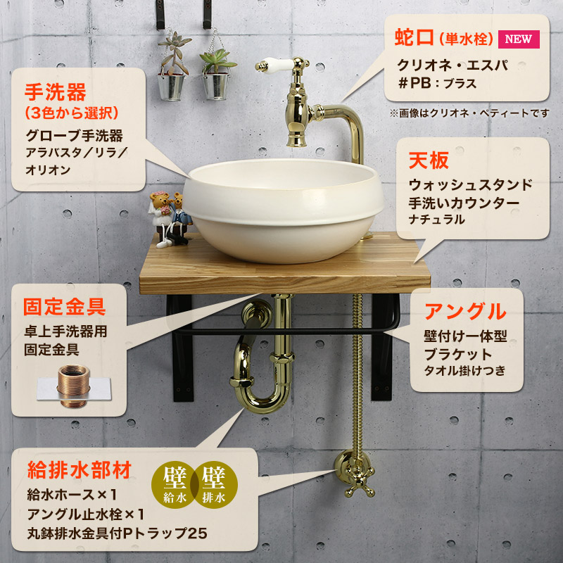 こちらのセットには専用の天然木の天板と取り付けに必要な部材が一式含まれているので、施主支給も安心。