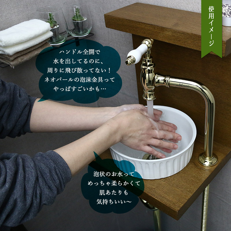 おしゃれなアンティーク調水栓マチルダのクリオネ・エスパは、ベッセル型手洗器におすすめの単水栓です。吐水ハンドルがボウルの真上に来るので濡れた手でハンドルを操作してもボウルが滴を受けてくれます。水が出る先端部分には、お水を泡状にする高性能な泡沫金具(ネオパール社製)が入っていて、水ハネを気にせず手洗いできます。