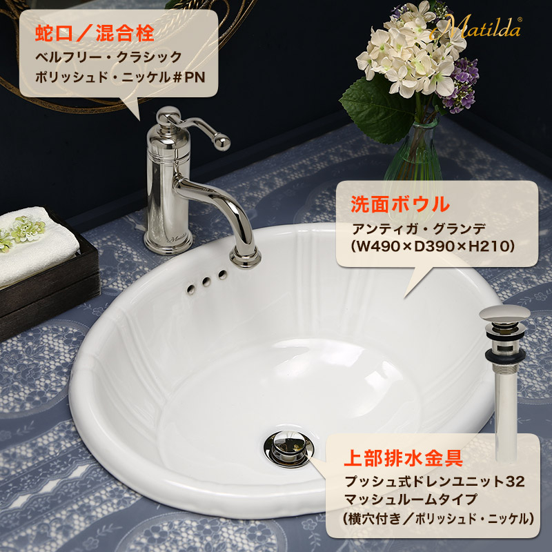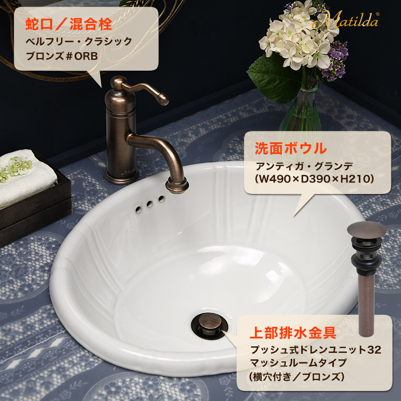 【ご注意】この商品は「蛇口・洗面ボウル・32mm規格上部排水ユニット」の3点セットです。※天板カウンター・排水トラップ管・止水栓は別売りです。