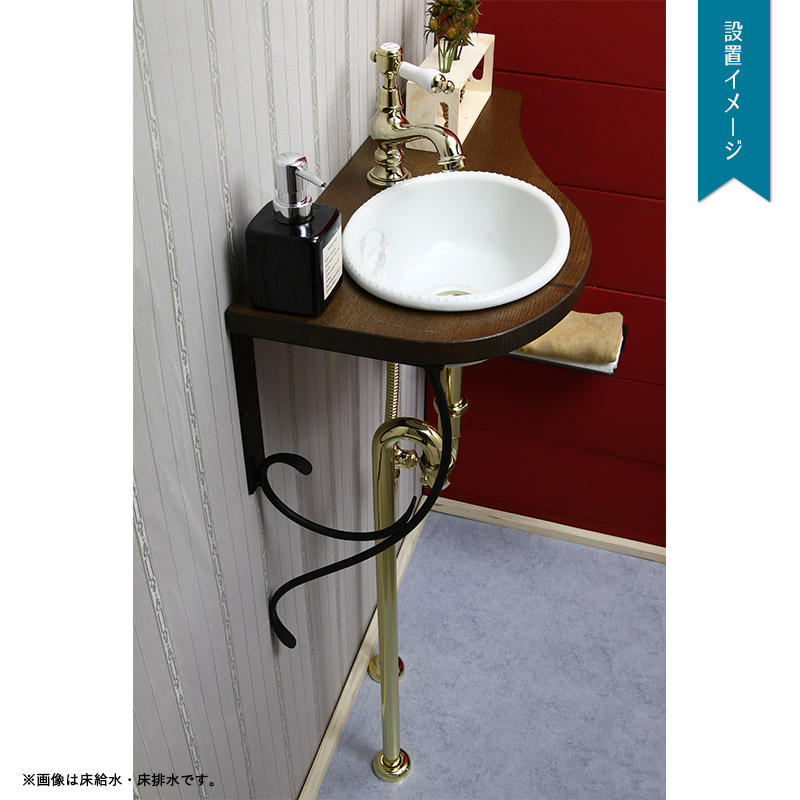 カウンター下の給排水は金色の配管部材を合わせて、見た目の統一感を演出。めっき加工が施された経年変色しにくいタイプの部材を使用していますので、金色の輝きを永く保つことができます。