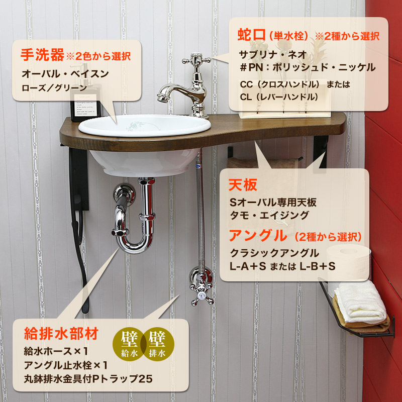 蛇口は2タイプ(陶器サインはCOLDまたはHOTから選択)、手洗器は2色、天板を支えるアングルも2種類の中から選べます。