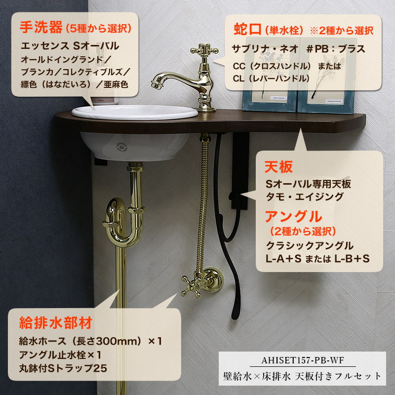 蛇口は2タイプ(陶器サインはCOLDまたはHOTから選択)、手洗器はレトロカントリーな雰囲気のあるエッセンスSオーバル5種から、天板を支えるアングルも2種類の中から選べます。
