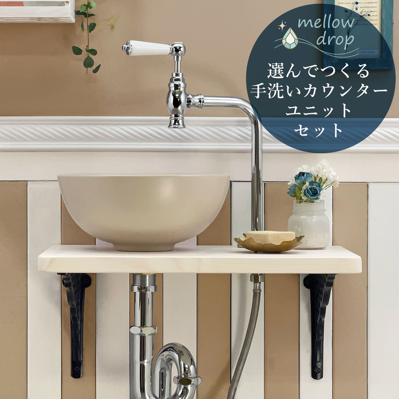 【mellow drop/メロウ・ドロップ】丸型手洗器(グレージュ)と選べる4種の単水栓 手洗い4点セット(プラスα)