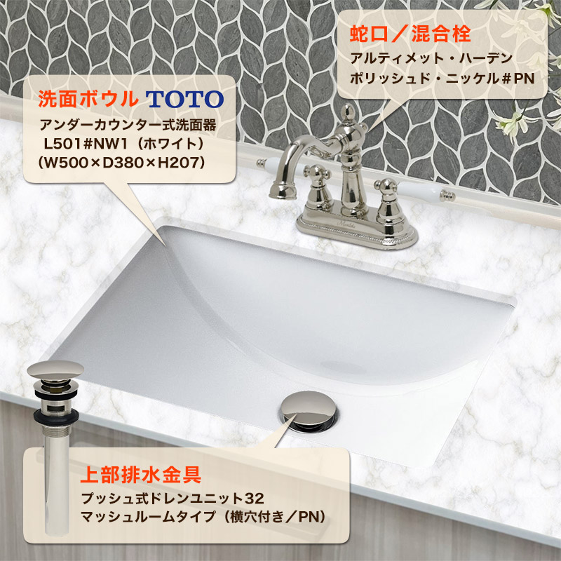 また、洗面ボウルの排水穴に取り付ける排水口金具もセットになっていますので、洗面所に統一感が出ます。