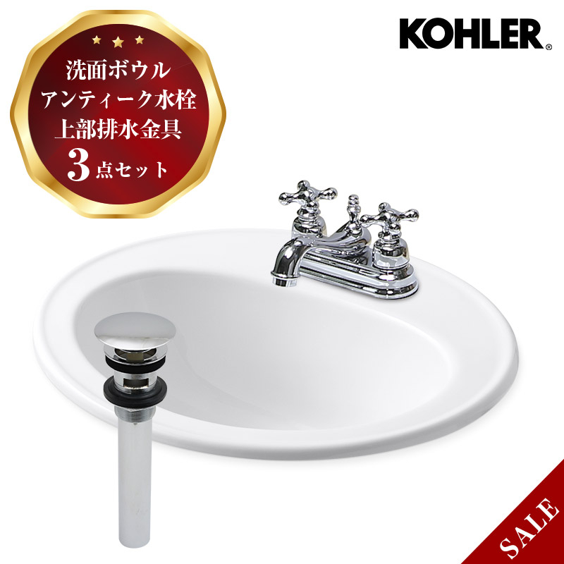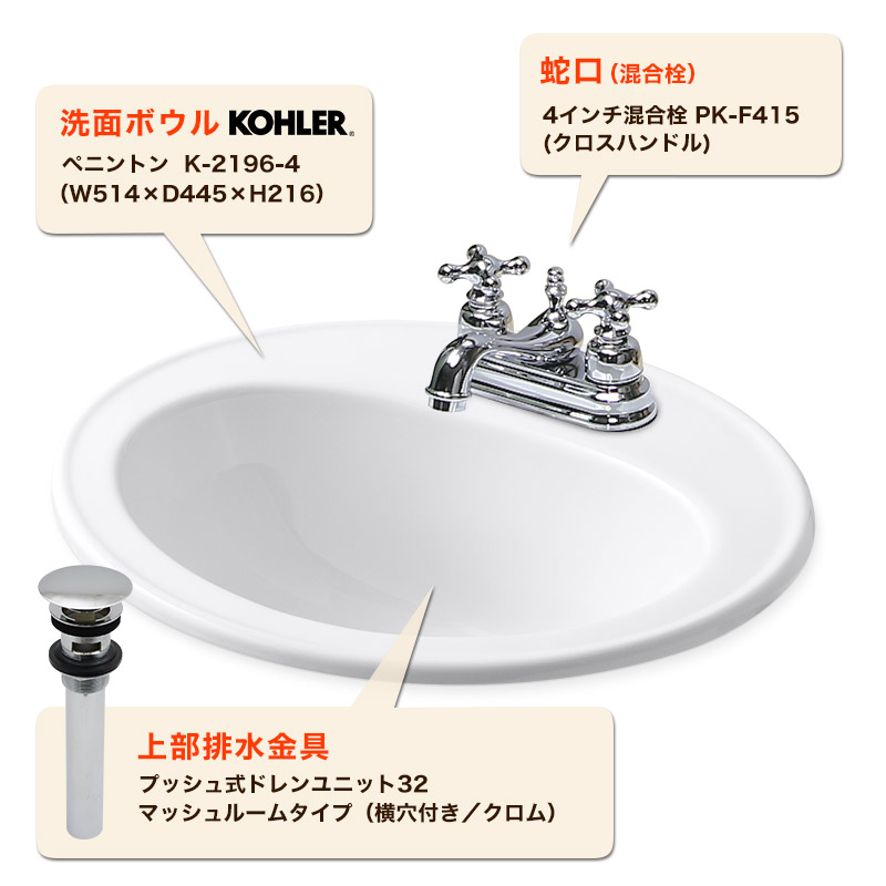 シンプルなデザインのKOHLER(コーラー)社製の洗面ボールに、PICKLES(ピクルス)の4インチ混合栓を組み合わせた洗面所向けの3点です。