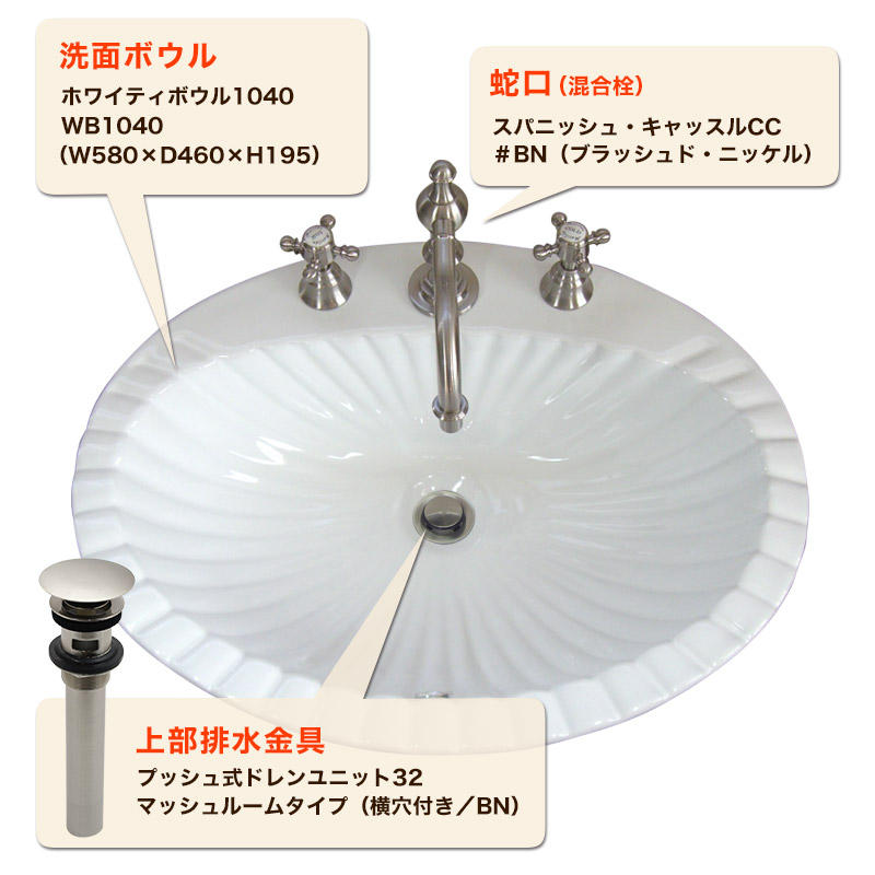 Whity Bowlシリーズの埋め込み洗面器に、Matildaのアンティーク8インチ水栓スパニッシュ・キャッスルCCを組み合わせたおしゃれな大きめの洗面ボウルセットです。