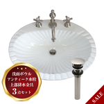 扇状のラインが印象的な、貝のようなデザインを施した洗面所用の大きめ埋め込みタイプ洗面器です。アンティークデザインの水栓にとてもよく似合う楕円形です。