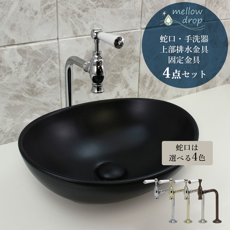 メロウドロップの楕円型洗面ボウル「おーばる」と、マチルダ水栓のアンティーク調単水栓「クリオネ」に、上部排水金具と天板固定金具が付属する手洗い4点セット。造作洗面台におすすめです!