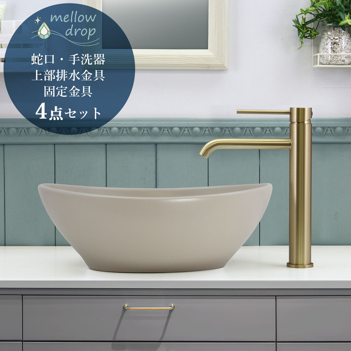 メロウドロップの楕円型洗面ボウル「おーばる」と、マットゴールド色の「ステンレス・ベッセル混合栓」に、上部排水金具と天板固定金具が付属する手洗い4点セット。造作洗面台におすすめです。