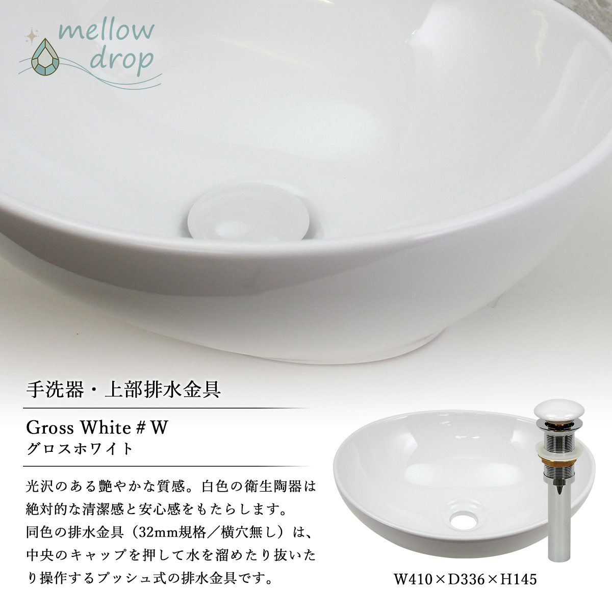 上部排水金具は、手洗い器と同色の磁器製キャップが可愛いメロウドロップ製排水金具(横穴無し)が付属します。キャップ(中央の目皿)を押すと水が溜まり、もう一度押すと洗面器に溜まった水が抜ける「プッシュ式」の排水金具です。小物の手洗い・漬け置き洗いをする際などにも便利です。