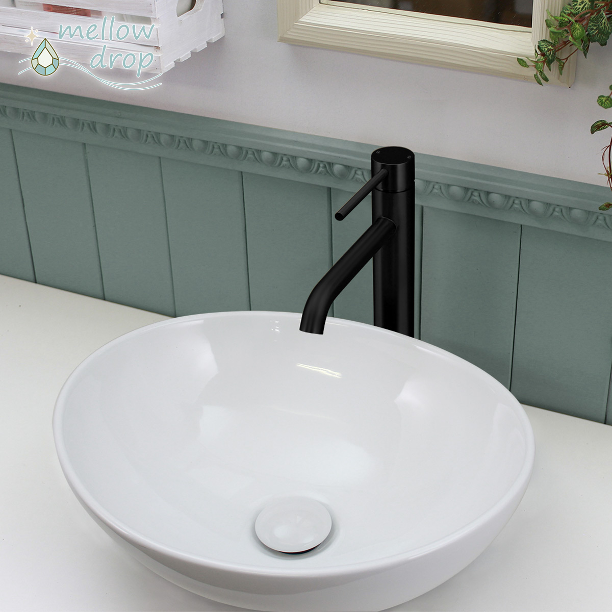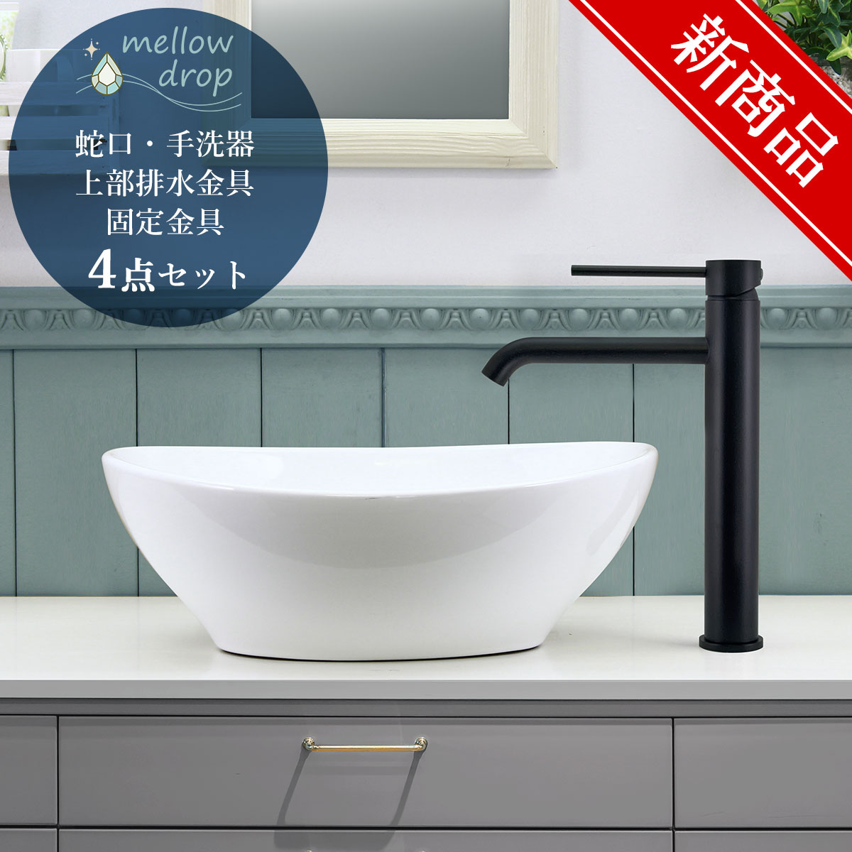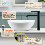 【mellow drop】楕円形手洗器 おーばる/OVAL(グロスホワイト) ×ステンレス製ベッセル混合栓(マットブラック)4点セット AHISET187-W