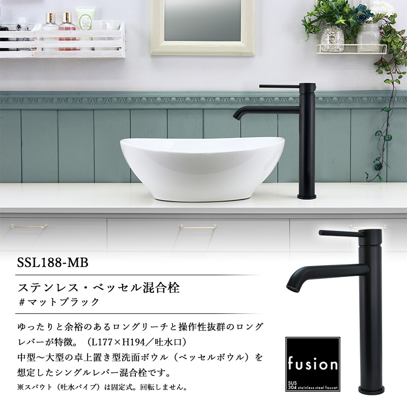 ステンレス製の立水栓「SSL188-MB」は、空間を引き締める黒色のマットブラック仕上げ。水とお湯が使える混合栓なので洗面用としてもお使いいただけます。艶消しの控えめな光沢は、空間に落ち着いたラグジュアリーさをもたらします。