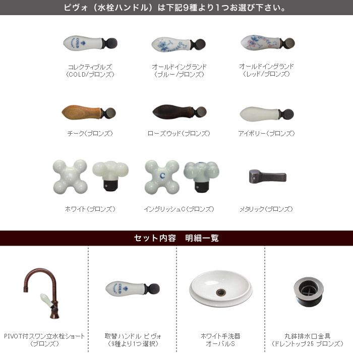 当社限定の取替えハンドル「PIVOT/ピヴォ」専用スワン立水栓と「プラン・ド・パリ」のホワイト手洗器/オーバルSを組み合わせたセットです。