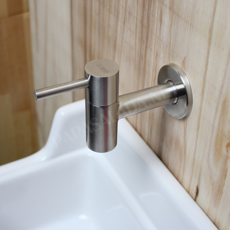 ルムのステンレス水栓のレバーハンドルが手洗器の真上にくるので、濡れた手でレバーを操作しても、床に雫が落ちません。